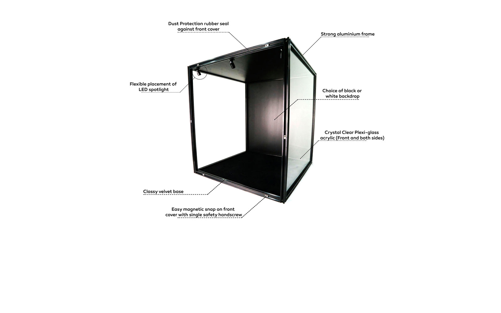 Maximum dust protection with our magnetic covers and flexible interior placement of shelves and lights.